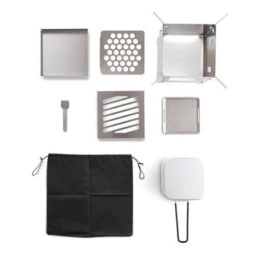 アウトドアでの調理・焚き火に クッカーで調理、鉄板で焼き料理、終わった後は焚火を楽しめる セット内容:焚き火台×1、アルミ製クッカー×1、ミニ鉄板×1、リフター×1、アルミ製クッカー用収納袋×1、取扱説明書×1 【焚き火台】材質:ステンレス鋼、耐荷重:約5kg、サイズ:収納時/約幅161×高さ151×奥行き161(mm)・組立時/約幅161×高さ186×奥行き161(mm)※五徳含まず、原産国:日本【ミニ鉄板】材質:スチール、サイズ:約幅125×高さ5×奥行き125(mm)、原産国:中国【リフター】材質:スチール、サイズ:約幅28×高さ105×奥行き7(mm)、原産国:中国 【アルミ製クッカー】材質:本体/アルミニウム(底の厚さ:1mm)・ハンドル/ステンレス鋼・フタ/アルミニウム・ハンドルカバー/シリコーンゴム(耐熱温度:180℃)・表面加工/アルマイト加工、サイズ:外径/約幅142×高さ114×奥行き130(mm)※ハンドル折りたたみ時・内径/約幅127×高さ100×奥行き127(mm)、満水容量:約1,500ml、原産国:中国【アルミ製クッカー用収納袋】材質:ポリエステル、サイズ:約幅295×高さ270(mm)、原産国:中国