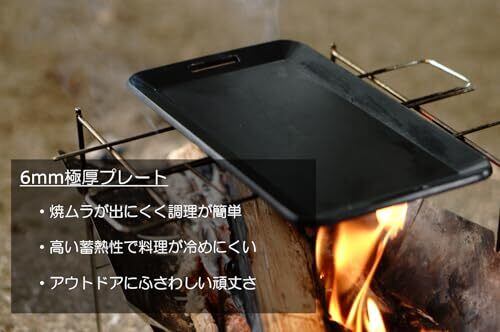 【鉄製に比べて極めて軽量】鉄の半分以下の重量で携行性に優れています。 【食材が焦げ付きにくい】フッ素コーティング加工を施し鉄製よりも遥かに焦げつきにくく調理の利便性もUP。また耐久性にもこだわりました。 【手入れが楽】鉄板と違いシーズニングが不要です。使用後は洗剤などでさっと洗えばOK。 【6㎜の超極厚設計】プレートの厚みを6mmと超極厚にすることで焼きムラが出にくく保温性にも優れます。 【ソロキャンプに最適なサイズ】250×150×6㎜と嵩張りにくくソロキャンプにぴったりな大きさです。 【料理の幅が広い】様々な料理に対応できるようフラットな形状にしました。 【専用リフター付き】ステンレス製で、頑丈かつ耐食性に優れます。