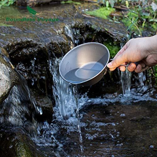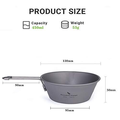 【重量】:チタン シェラカップ 53g+折りたたみスプーン 約17.5g 【サイズ】:直径13cm x 高さ5cm;取っ手の長さ9cm 【材質】:99.8%純チタン;健康および環境保護,耐食チタンは極めて軽量で金属臭や金属味が全く残らない 【食洗機対応】:アウトドア用チタンボウル,食洗機対応 【超軽量】:チタンシェラカップ,軽量 ポータブル ,持ち運びしやすい・アウトドア料理・キャンプ・BBQに最適,折り畳み式取っ手の長さは丁度良く,メッシュバッグとボックス付き