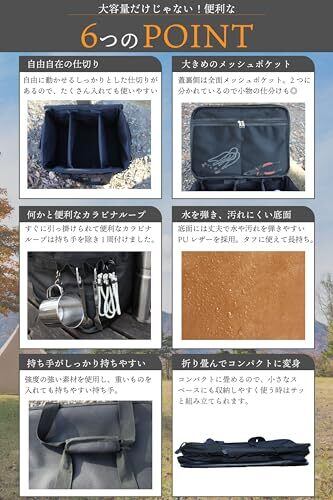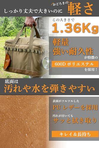 【丈夫で軽い!大容量なソフトコンテナボックス】キャンプやアウトドアに欠かせないソフトコンテナボックスです。大容量なのはもちろん、収納のしやすさにもこだわって作られた商品です。39Lの大容量ソフトボックスには収納しやすいポケットや仕切りが付いていて使いやすさ◎ランタンや焚火台、ペグ等、キャンプに必要なものを沢山収納可能です。大きくてしっかりとした作りのソフトコンテナなのに1.36kgと軽量設計なのもこだわりポイントです。 【タフさが自慢!アウトドアの味方!】タフで耐久性の高い600Dポリエステルを外側に使用し、底面には撥水性のあるPUレザーを採用しました。タフで丈夫なので、アウトドアシーンで大活躍間違いなしのソフトコンテナボックスです。 【使わないときはコンパクトに折り畳み可能】使わない時は簡単に折りたたみ可能な仕様で、10cmの厚みに大変身!重さも1.36kgと大きいのに軽量で、置いておくのにも邪魔になりません。車の中や家の隙間に収納できて、使う時はすぐに自立するコンテナボックスに変身します。 【まだまだある多機能収納ボックス】ソフトコンテナならではの縫製仕様なので、カラビナループを使用すればロープなどを吊るすことも可能です。すべてのギアやアイテムを収納できて一気に持ち運べます。用途も様々で薪キャリーやゴミ箱としても使えます。大容量で仕切り部分はマジックテープ仕様なので自由自在に仕分けができて使いやすくカスタムできます。 【サイズ】横:42cm、縦:32cm、高さ:29cm(折りたたみ時:10cm) 重さ:1.36kg