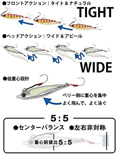 スイッチライダーは比重の軽い亜鉛系素材を使用したメタルジグ。ヘッド部とフロント部アイを配置した。取り付け位置をスイッチすることで、自然なスイミングからウォブリングまで1本で2通りの演出 が可能です。