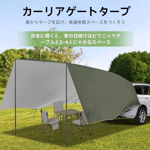 KOMCLUB 車用 タープ カーリアゲートタープ オープンタイプ カーサイドテント 日よけカーテント 車中泊テント 様々な車に対応 設営簡単 連結 suvテント 防風防水 UVカット 紫外線防止 アウトドア キャンプ 公園 登山 車中泊 ポール2本付き ペグ 収納袋付き