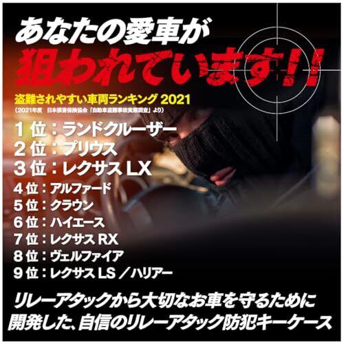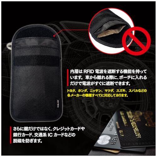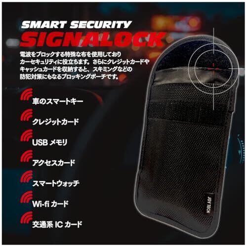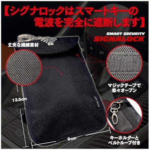 スマートキーをシグナロックに入れるだけでRFID電波をすぐに遮断できます。窃盗犯が近づいてもリレーアタックを未然に防ぐことが可能です。トヨタ、ホンダ、ニッサン、マツダ、スズキ、スバルなどの各メーカーの機種すべてに対応しております。 電波をブロックする特殊な布を使用しておりカーセキュリティに役立ちます。さらにクレジットカードやキャッシュカードを収納すると、スキミングなどの防犯対策にもなるブロッキングポーチです。 使いやすさを追求したコンパクトなデザイン。フタがマジックテープになっており開閉が楽々。また、落下防止のキーホルダーとベルトループ付き。常にスマートキーを身に着けたい方におすすめです。 【内容】リレーアタック防止キーケース1個 【サイズ(約)】縦13.5㎝×横9㎝ 【重量(約)】40g 【カラー】ブラック