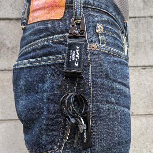 複数のカギを一束にまとめて携帯できるキーホルダー。 リングも計4個付属しており、収納力もばっちりです。 ベルクロが付いているので取り外しも簡単です。 カバンやベルトループなどに、 カラビナで引っ掛けても、ベルクロで固定してもお使いいただけます。 お出かけの相棒に。 新品。 【SIZE】 横幅:約130mm 縦幅:約32.6mm