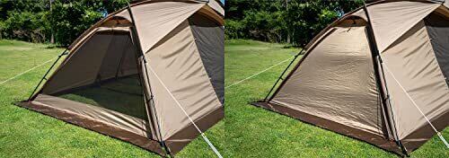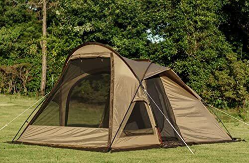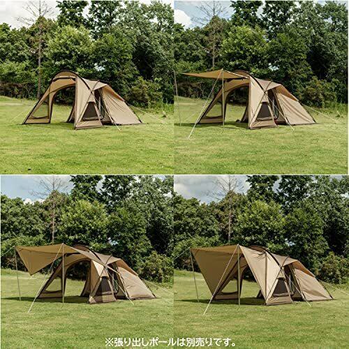素材:(フライ)ポリエステル75d(耐水圧1,800mm)、(インナー)ポリエステル68d、(グランドシート)ポリエステル210d(耐水圧1,800mm)、(ポール)6061アルミ合金(直径14.5mm、直径11.8mm) サイズ:258(横幅)×160~192(高さ)×356cm(奥行) 重量:フライ約4.96kg、インナー約1.6kg、ポール約2.8kg、付属品2.15kg 付属品:張り綱、アイアンハンマー、スチールピン、収納袋 カラー:サンドベージュ×ダークブラウン