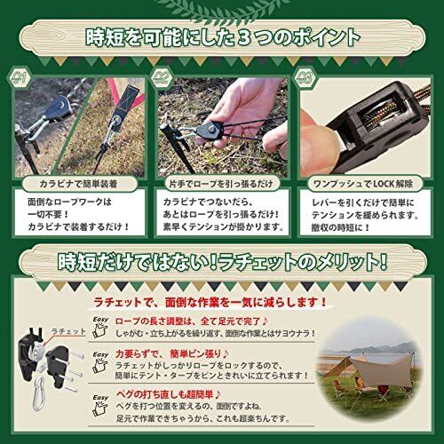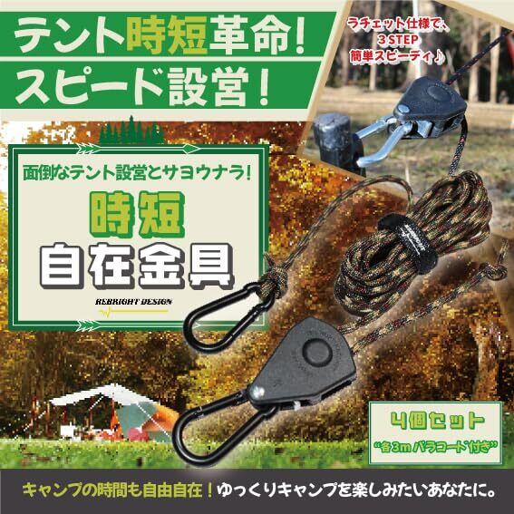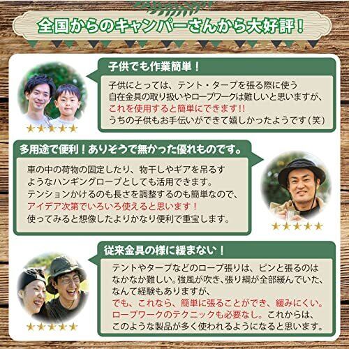 ⛺大反響につきリニューアル!!4個セットには、本体のラチェット型自在金具に、「ブラックカラビナ」&「キャンプに映える迷彩柄ガイロープ(3m)」&「収納時に便利なロープをまとめるマジックテープ」「持ち運びに便利な巾着型専用収納袋」の4点を標準装備しました。 ⛺【キャンプ設営の超時短に!】面倒なロープワークが不要!簡単にテントやタープ設営ができます。早くキャンプしたいのに、なかなか設営が終わらない~!とお悩みの方に是非! ⛺【撤収も超時短!】もちろん、撤収も超簡単!サクッと設営、撤収!本商品をご利用いただき、ゆっくりキャンプの時間をお楽しみください♪ ⛺【超簡単仕様】力不要で、手元の作業でテントやタープのロープにテンションを掛けられるので、お子様や女性でも簡単に使用できます。お子様と一緒にキャンプ設営をお楽しみいただけます。きっと良い思い出作りのお役に立てるはずです♪ ⛺ご使用方法】①テント、タープにカラビナで装着。②一方のカラビナをペグに繋げます。③片側のロープを引っ張るだけで、ピンとロープを張ることができます[3アクション完了♪]長さの調整も超簡単♪ ⛺【様々なキャンプシーンで大活躍!】テント、タープの設営の自在金具としてはもちろん、車へ積み込んだキャンプ道具の固定に!バイクの荷台への道具の括り付けに!シェルフやタオルの物干しロープに!シェラカップ等のハンギングに!おうちに帰ったら、キャンプ道具をまとめるロープとしてご活用ください♪ ⛺【選べる2個セット/4個セット】「1個=本体+カラビナ2個+ガイロープ3m+マジックテープ1本」の2個セットと4個セットをご用意。お好きなセットをお選びください♪