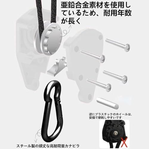 1⛺【結ぶ作業不要!取り付け簡単】亜鉛合金の滑車がガイラインを留めます。耐用年数が長い、動きが滑らか、組み立てが簡単なのが特徴です。トグルスイッチのデザインで、ガイラインの長さを自在に調整することができます。スイッチを下げるとガイラインをすぐに緩めることができます。つまずきを防ぐ高反射性ガイライン、スチール製の頑丈な高耐荷重カナビラが付いています。 2⛺【製品パラメータ】カラー:ナイトブラック、製品:サイズ、10×6cm、ガイラインサイズ:φ4mm×4m優れた耐久性を持つポリエステルで編まれています。 自在金具素材:ナイロン+亜鉛合金、重量:約375g(4つ入り)、1セット:4つ入り、カナビラの耐荷重:150lbs。 3⛺【耐摩耗性】4mの超長ガイラインは、キャノピーポールのガイラインとして使用することも、さまざまな用途に使用することもできます。丈夫なガイラインは破損しにくく、引張力が強く、滑らかに動きます。亜鉛合金製の滑車部分は耐久性があり、スムーズに動き、耐摩耗性が高いのが特徴です。ナイロン素材のカバーは、高温に強いので、日差しにさらされても変形しにくく、品質が高く耐久性があります。優れた素材を採用しているため、屋外での使用に適しており、簡単には錆びません。鉄製のカナビラは耐荷重性能が高く、高耐荷重カナビラの耐荷重は150lbsとなっています。カナビラのロックは二重の保護が施されており、しっかりとガイラインを留めることができます。 4⛺【屋内外で幅広く使える】屋外でガイラインとしてだけでなく、物干しロープ、牽引ロープ、車内用吊り下げロープ、防災時のロープとしてもお使いいただけます。ハイキング、キャンプ、ピクニック、バーベキュー、花見、釣り、屋内外での活動に最適です。 5⛺【安心してお買い求めいただけます!】100%の品質を保証いたしますので、安心してお買い求めください。ご質問やご不明な点がございましたら、お気軽にお知らせください。24時間以内にカスタマーサポートが誠実に対応し、お客様にとって最適な解決策を提供いたします。