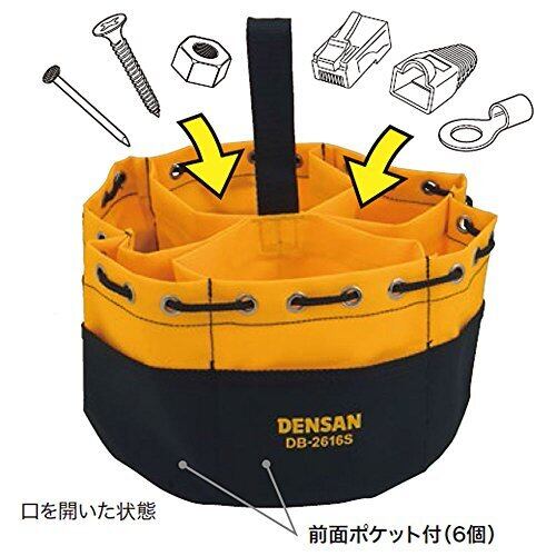 口を絞れば中身が落ちない! 巾着タイプの収納袋! 6つの仕切りで小分け収納 ネジ等を種類別に小分け 前面ポケット付(6個) スプレー缶入れにも最適