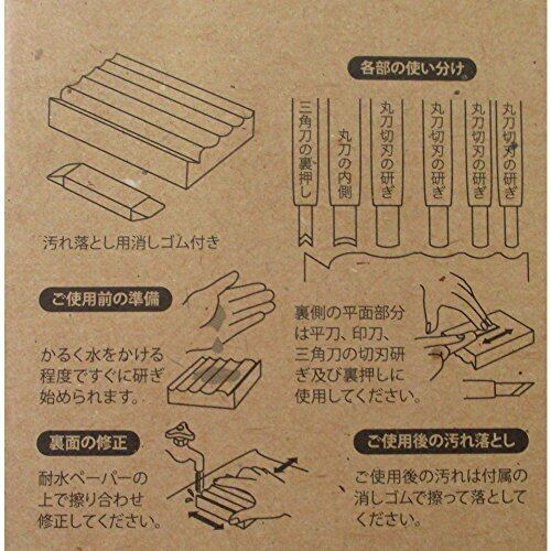 用途:彫刻刀を研ぐ際に 対象:平、三角、丸、印刃 溝:丸刃用、三角刃用の計6点 付属品:汚れ落とし用消しゴム付 ご使用方法:かるく水をかけ、ご使用ください
