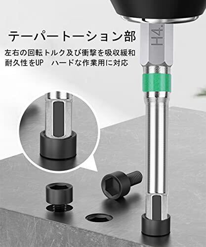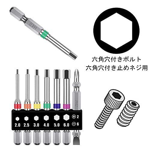 【商品仕様】セット内容:対辺2/2.5/3/4/5/6(片頭ヘックス各1本)、+2/-6(双頭ビット1本)。入り数:7本組。軸径:6.35mm六角軸。全長:65mm。素材:クロムバナジウム鋼。 【カラーリング】カラーリングでサイズが分かりやすいです。ホルダー付き、ビット整理収納に便利です。ビットはマグネット入ります。 【高耐久ビット】高品質の工業用特殊合金鋼を鍛造し、熱処理技術を採用して、高硬度、トルク、靭性、およびより耐久性が実現します。 【適用機種】電動・エアー・充電インパクトドライバーなどに適しています。 【幅広い用途】六角穴付きボルト、六角穴付き止めネジ用です。機械設備、空圧機器、金型、建材、家電、配電盤、自動車やオートバイなどの組み立て、メンテナンスに適しています。