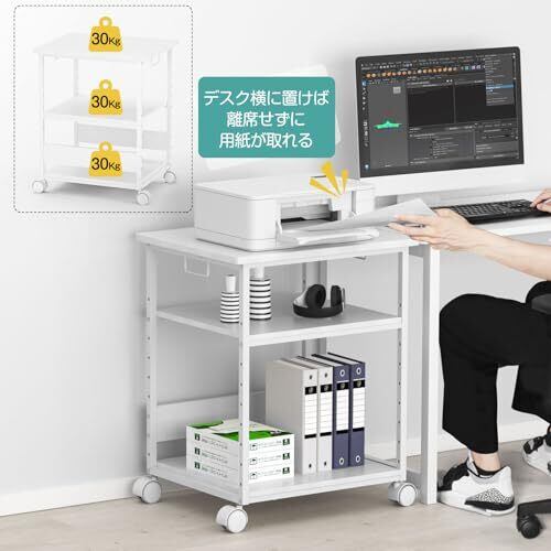 ✅【総耐荷重90Kg・プリンター台】 幅60×奥行50cmの広い天板は60Kgの耐荷重あり、インクジェット複合機、レザープリンタ、オーディオなど重いものを載せてもしっかり支えます。中棚と底棚はそれぞれ15Kg耐荷重があるため、用紙やインクなどプリンター周辺小物をたっぷり収納できる一体型のプリンタラックです。 ✅【普通のデスクと同じな高さ70cm】 一般的なパソコン・机・デスクと同じ高さ70cmなので横で並べて使用でき、サイドデスク、コのデスク、L字デスク、サブデスク、pcワゴン、pcラック、パソコンラックとしても活躍されます。中棚の高さは5cm間隔で7段階調節が可能です。ご利用のシーンお及び収納物に合わせて高さ調節できます。※頻繁に移動する場合、キャスターの取付をご推奨いたします。 ✅【9段階高さ調節の中棚とサイト板】 中棚の位置は5cm間隔で9段階の上下調節が可能です。収納する機器や小物のサイズに合わせて変更できます。パソコンラックの両側は落下防止バーが付いて、パソコンの収納や移動でも安心できます。また、プリンター台の両側も取っ手付いて、どちらの方向でも本体を引き出すことができて、パソコンの配線をメンテナンスするときに便利です。 ✅【2タイプの足がつき 】 プリンター台はお客様のご使用シーンに合わせてアジャスターとキャスター両方が両方ついております。アジャスターはガタつきを微調整できます。ロック付きキャスター移動・据え置きに便利です。軽い力で移動させられるので、お掃除も楽にできます。前輪にはストッパーが付いているので使わないときはピタッと固定できます。フローリングを傷つけにくいです。 ※頻繁に移動する場合、キャスターの取付をご推奨いたします。 プリンタ台の天板、棚板、フレームのカラーを全部高級感に溢れるブラックを採用されましたので、オフィスだけでなく、ご家庭のリビングや書斎、キッチンに置いても、違和感なくお部屋のインテリアに馴染みます。天板や棚板は耐熱性・耐水性・耐候性・耐摩耗性に優れているメラミン化粧板を使って長くお使いいただけます。フレームも粉体塗装付きで傷、サビ防止などにも強いです。品質自信がありますので、全商品1年の品質保証を付きます。お気軽にご連絡お願いします。24時間以内にサポートします。