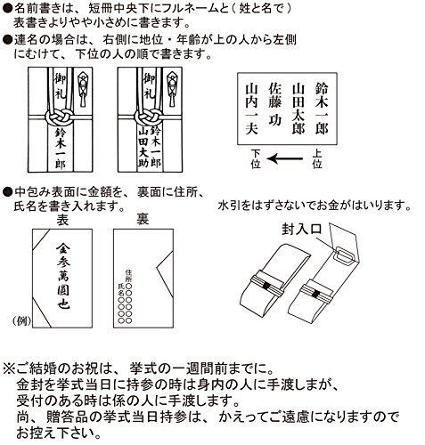 【用途】ご結婚御祝・お祝用 【使用地域】全国共通 【サイズ】H185XW105mm 【付属品】短冊各種、中袋付き 【短冊明細】御結婚御祝・御祝・寿・白無地 (各1枚) 【金額の目安】1万円位~ 水引を外さないでお金を入れることができる祝儀袋です。 パッケージの裏面にはご祝儀の書き方(結婚祝いの書き方)を記載しております。