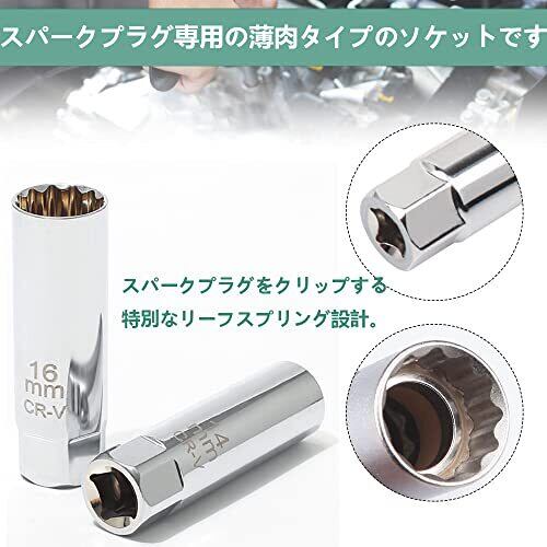 【セット内容】14mm1本&16mm2個セットでご用意しております。軽量でスリム、持ち運びに便利で柔軟性があり、狭い環境でも使用できます。 【実用】内部の金属製リテーナーがスパークプラグを保持して保護し。プラグ穴にネジ込む際もメネジを傷めにくいです。変形することなく、より大きな圧力に耐えることができます。 【優れる材料】このスパークプラグソケットレンチはは高品質なクロムバナジウム鋼を採用しております、耐久性、耐食性、強度、耐久性に優れて、より長い使用寿命を確保することができ。 【使いやすさ】スパークプラグソケットには、スパークプラグをしっかりと保護できるマグネットが内蔵します。分解・組立が容易で、スパークプラグをソケットにしっかりと取り付け、分解しやすくグリップ力に優れています。 【利用用途】スパークプラグレンチは自動メンテナンス、オートバイエンジンのスパークメンテナンス、機械メンテナンスなどの用途に使用できます。