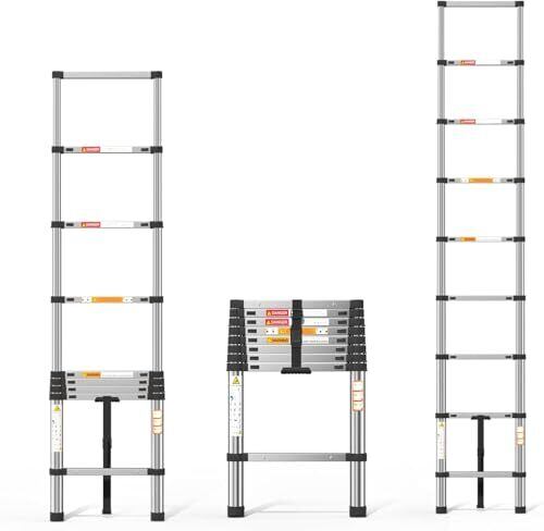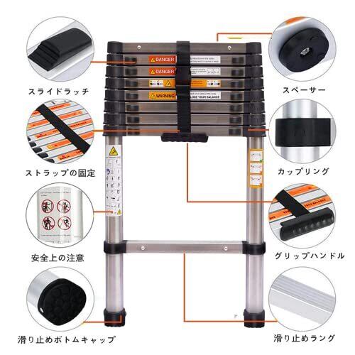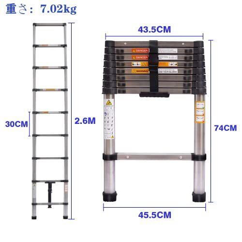 【2025年新しいステンレス製はしご】表面が光沢があり、傷がつきにくい、美しく耐久性があります。ステンレス鋼はアルミニウムより炭素含有量が多い、硬さが強く、耐摩耗性も良いし、優れた防食性能を備え、錆びにくいです、高湿度環境で長時間使っても大丈夫です。メンテナンスも簡単で、使いやすいです。ステンレス鋼は頑丈で耐久性があり、鉄と炭素元素の混合物です。十分な炭素含有量により、反りに非常に強く、合金鋼のはしごの耐用年数が大幅に長くなります。 【頑丈で安定&操作簡単】はしごは150kgの運搬能力を持つ高硬度ステンレス鋼製です。アルミニウムの材質は軟らかいため、荷重が強いにもかかわらず、アルミ製のはしごを使用すると、避けられないわずかな屈曲現象が現れ、恐怖を感じやすい。ステンレスはしごはそれを克服しました、鋼のはしごの材質はやや硬くて、アルミニウムのはしごと同じ体積の状況の下で、全体の強度と荷重の能力はすべて更に強くて、しかも基本的に曲がって現象が現れないで、目に見える安全で、人に更に安心させます。つま先キャップは、凹凸構造、テーパーデザイン、滑り止め設計を採用し、各ペダルも滑り止めボードを採用し、安定性を確保しています。各ステップには個別のロックが装備されています。 ステップを簡単に調整して、任意の高さに到達または後退させることができます。 【持ち運びが簡単、収納が簡単】商品のサイズ全長:2.6m*0.46m。収納時:0.74*0.46m。重量:約7.2kg,軽量安全設計により耐荷重150kgを実現!階段数量:8段, 用途に合わせて必要な高さに調整可能。折りたたまれた段部は固定ベルトでしっかり固定できるので、持ち運びに便利です。この多機能伸縮はしごは折りたたむと小さくなり、車のトランクやキャビネット、ソファの下などの狭い場所に簡単に収納できます。 【生活をより便利にする】高所で問題が発生し、自分で解決できない場合はどうすればよいですか? このはしごを使えば、電球の交換が簡単にでき、窓や木の枝の大掃除、車の洗浄、高処作業、外壁の修理、屋根の除雪、屋根の水族館の掃除など、さまざまな問題を解決できます。 生活がより便利で快適になります。 【滑り止め設計】滑り止めの為の凸凹構造の"防滑ステップ"。人間工学によって設計しているので持ち運びやすい"持ち手ハンドル"。底部は地面をしっかり支える設計、凹凸構造で摩擦力を上げる特殊な"グリップ"。3つの設計の下、滑りにくいはしごを実現。