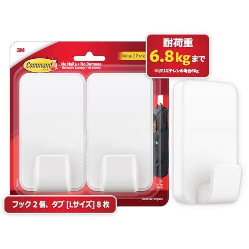 【製品情報】XXLサイズ (耐荷重6.8kg※ポリエチレンの場合6Kg) / セット内容:フック2個、粘着タブ8枚(Lサイズ) / ホワイト 【ツルツル面でもしっかり固定】ガラスやタイルなど、屋内の様々な平滑面にしっかりと設置できる超強力なコマンド フック。大きなバッグ、厚手のコートやジャケットなどもしっかりと支え、備品などの収納に便利。 【ペタッとカンタン設置】コマンド タブで貼り付けるだけなので、壁に穴をあける必要がありません。工具を使わずに手軽に取り付けられます。 【壁をキズつけず、キレイにはがせる!】不要になればコマンド タブを取りつけ面にそってゆっくり伸ばすだけ!跡を残さずキレイにはがせるので安心してご使用いただけます。お部屋の飾りつけやデコレーションも、好みや気分に合わせて気軽に楽しめます。はがした壁掛けフックは、粘着タブを取り替えるだけで再利用できます! 【取りつけ前の準備で粘着力をフルに発揮!】取りつけ面をキレイにし、ホコリや油分を取り除いた後、完全に乾かしてから粘着テープを貼ることで粘着力が十分に引き出され、しっかりと固定ができます。 ※壁紙面にはご使用いただけません。