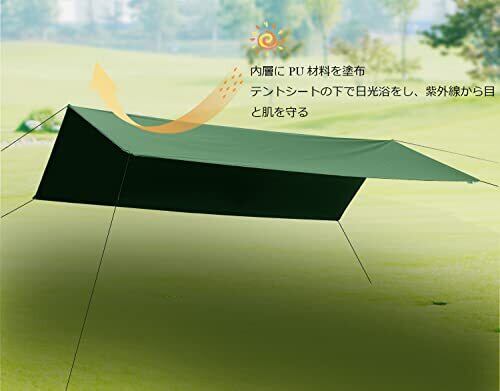 ★【製品仕様】「サーズ」:300cm*300cm ★【防水仕様】防水オックスフォードの生地を採用して、高耐水の効果があります。タープ本体の縫い目もしっかりと縫製されており、結構な雨でも対応できるので心配がありません。 ★【遮光遮熱】黒ゴムのコーティング-紫外線をカットして肌を守り、日焼けと熱射病を予防し、暑い日にも涼しい!眩しくない!心地いいです。屋外、レジャー、その他のアウトドア活動に大活躍。 ★【軽量&携帯便利】携帯の便利さを考えこそ、生地がかなり薄いです。そのおかげで収納サイズが小さくまた軽いです。袋につめた状態でも場所をとりません。持ち運びも楽でツーリングキャンプの時にも携行しています。汚れても水洗いができ、お手入れが簡単です。 ヒント-このバージョンのテント防水布には電柱がありません。