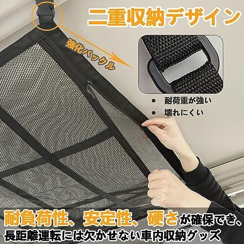 車内天井収納 ネット 90*65cm 荷物落下防止 車用収納ネット 2層タイプ ファスナー付き ルーフネット車 収納便利 ポケット付き 荷物固定ネット バックル固定 調整可能 荷物収納ネット カーゴネット ブラック