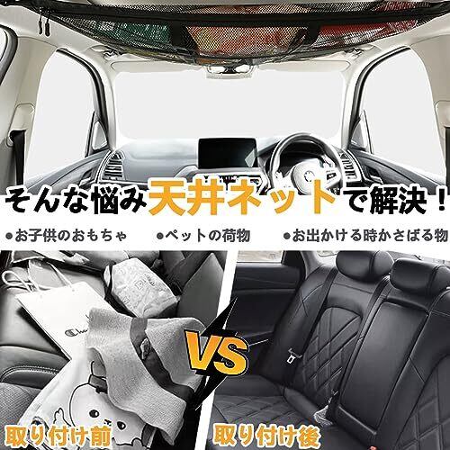 【荷物収納】布団、充電ケーブル、おむつ、アウトドア用品などを全部収納できる天井収納 ネットで、一瞬で車内がきれいになります。小さい車ながら収納スペースが稼ぐことができます。またファスナー付きポケットとなっており、荷物の脱落を防ぐことができますのも魅力です。 【二重収納デザイン】車内天井収納ネットはポリエステル素材を采用しており、丈夫で壊れにくいため、長距離運転には欠かせない車内収納グッズです。車ルーフネットは2層タイプで、厚さと締め付けはすべて進級を得ました。トップ収納網は耐負荷性、安定性、硬さが確保できます。 【簡単取付】アシストグリップにベルトを通すだけで取り付け完了!車天井収納ネットは調整機能付き固定ベルトがあるので、長さを調整でき,工具不要、四隅に簡単固定できます。たためるので使用しないときはコンパクトに収納できるから邪魔になりません。 【変形しにくい】軽い物を主体とした収納するネットです。メッシュ部分も伸縮性のないしっかり素材でつくりました。取り付け時にピンと張って設置することで荷物を置いた後も視界良好です!メッシュになっていて、探していますものをすばやく見つけることができますので、幸せ感がアップする収納ネットです! 【対応車種】車の周りに4つのハンドルがれば、取り付けて使用することができる汎用性が高いネット。軽自動車、ミニバン、バン、RV車、SUVなどより多い車種に適応。天井スペースが確保できるルーフの高い車をおすすめです。