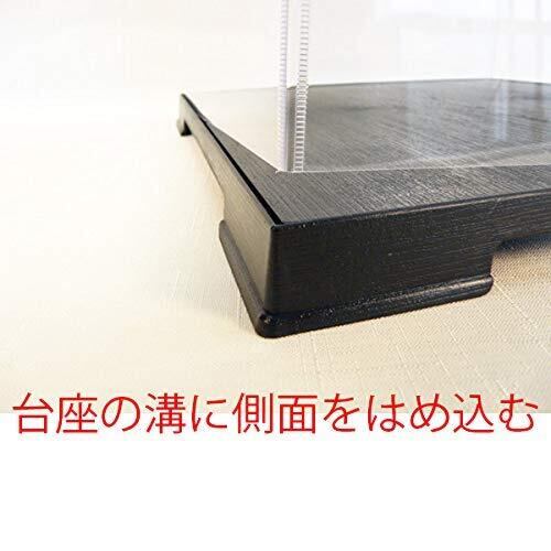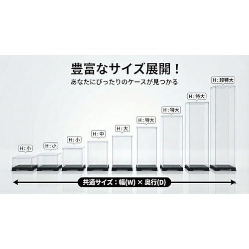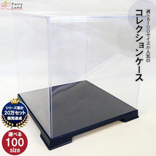 折りたためるコレクションケースです。 選べる100サイズでピッタリサイズが見つかります。 コレクションケースは底板(黒色厚さ約1mm)及び天板(透明)はプラスチック(厚さ約1mm)、側面(周囲)は透明のプラスチックシート(塩化ビニール厚さ0.35から0.5mm)で形成されています。 底板、天板、側面は分離でき、側面は折りたたみ式です。 台座(底板)の高さは約2cmから3cmです。 表示寸法は基本的に内側寸法となります。 ただし、高さの内寸法はHP表示寸法より約1cm小さくなります。 寸法は多少のバラつき(+0.5cm -1.0cm程度)が発生いたします。大きさは余裕をもって寸法をお選びください。