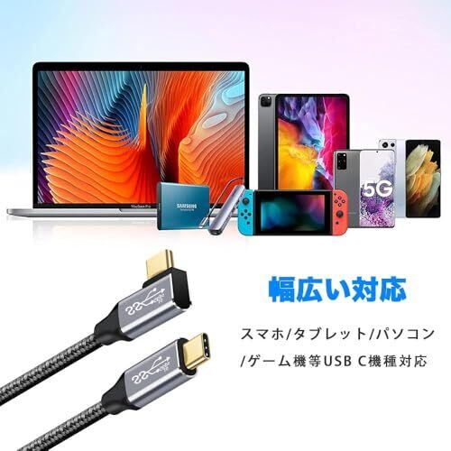 【100W急速充電/L字設計】USB Cケーブルは最大20V/5A (100W)まで安全かつ安定して出力できます。L字型コネクタ設計: 90度アングルコネクタにより、充電中やゲームプレイ中でもケーブルが邪魔にならず、快適に使用できます▲充電器と接続する機器がPD対応している場合に限ります。※ご使用のデバイスにより供給スピードが異なります。 【10Gbpsデータ転送&4K@60Hz高解像度】Type C to Type C ケーブルが最新のUSB3.1 Gen2技術を採用、理論的にデータ転送速度は最大10Gbpsまで達せます。HD映画を10Gbpsのハイスピード転送により、数秒で転送できます。ご注意:10Gbpsは理論上の最大転送速度ですが、実際の速度はパソコンや線材などの影響を受けますので、実際の伝送速度を基準にしてください。 【安全な保護機能搭載】優れたE-Markerスマートチップ,最も安全な100Wの急速充電を実現する最先端のスマートチップです。過充電、発熱と短絡を防止するE-markerスマートチップを搭載し、安定性の高い急速充電と大切な機器の損傷防止を実現します。 【優れたの高耐久性】USB type Cケーブル長さ:約0.5m。3重に編み込まれた高耐久ナイロンを採用、ケーブルの強さと柔らかさを両立し、コード部分はねじれや折れに強く、断線しにくい。10,000回以上の曲げ試験と10,000回以上の指抜き試験にに合格しており、耐久性にとても優れております。 【幅広い対応性】USB-Cに対応したスマートホン、ゲーム機、パソコン及びその他のデジタル端末に対応します。MacBook Pro 14" 2021、MacBook Pro 16"、MacBook Pro 15.4"、MacBook Pro 13.3"、MacBook Air 2018-2020、MacBook 2015-2017、iPad Pro 2018-2020、iMac(2020)/iMac Pro/Mac mini(2018)、Surface、Xperia、Galaxy、Pixel等Type C機種対応。