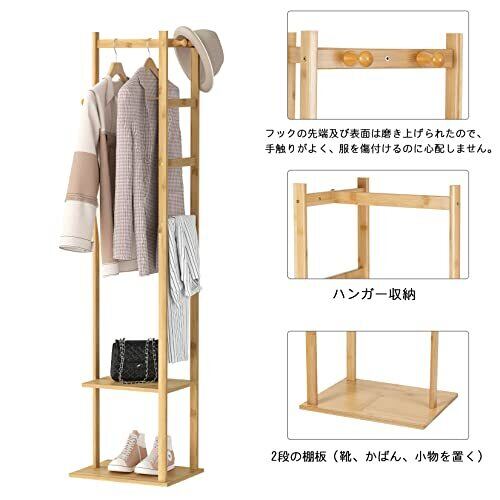 【多機能・収納力抜群】棚板もハンガー収納もフックも付いているため、コートや帽子、鍵、バッグなどをかけられるほか、靴/弁当箱などを置くこともできます。お出かけ準備にかかせない道具を1つの場所に収納できるため、お出かけ準備がスムーズにできます 【スリムタイプ・省スペース】スリムなデザインのポールハンガーなので、玄関などの限られたスペースにも置きやすいです。見た目がすっきりと収納することができるため、1人暮らしの狭い玄関にもおすすめのポールハンガーです 【設置しやすいスクエア型】四角な置き型タイプなので、コーナーや壁際にも簡単設置できます。壁に穴を開けて傷つけないので、賃貸マンションでも気軽に使えます 【頑丈で安定感抜群】14*30mmの太い竹材を採用し、作りもしっかりしているので、安定性に優れていて、冬物のロングコート等もラクに掛けられます。底板も広いので、しっかりと支えていて倒れにくいので、安定感を重視したい方におすすめです 【インテリア性も機能性も兼ね備えます】シンプルなデザインで、すっきりと洗練された印象のポールハンガーなので、リビングや寝室などに1つ設置すると、心地良い生活感を与えてくれるワンポイント収納になります