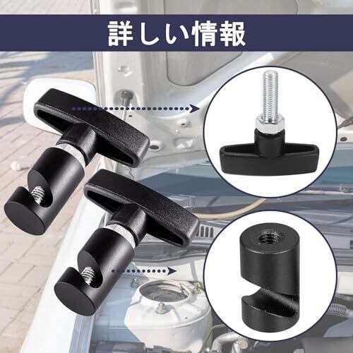 【製品パッケージ】ボンネットストッパー*1個入り(黒) 【機能】リフトサポートクランプは、車のトランクとボンネットをしっかりと固定するように設計されています。 走行中は、リフティングロッドの落下による損傷を防いでください。 リフティングロッドは、フードと荷物の安全を確保します。 【上質な素材】高品質のアルミニウム合金製、耐傷性、錆びにくく、丈夫で長持ちします。 【ユニークなデザイン】フード ストラット クランプは、力がかかる部分が湾曲した構造になっており、以前のほとんどのフラット サポート フレームよりも大きな力の領域を持っています。シリンダーの隣のリフティングロッドにツールを置き、リフティングロッドに固定されるまでノブで締め、信頼性の高いロック機能を提供します。 【操作が簡単】このダンパーストッパーを使用してダンパーに噛ませて固定するだけで、ボンネットが落ちてくるのを防ぎます。