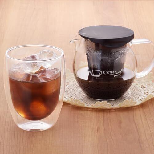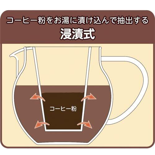 サイズ:ポット/約径10.5×口径8.0×最大幅14.5×高10.8㎝ ストレーナー/約奥7.8×幅8.5×高9.6㎝ スプーン/約径5.1×長9.5㎝ 材質:ポット/耐熱ガラス、フタ/ポリプロピレン、メッシュストレーナー/ポリプロピレン、メッシュ部分/ポリエステル、スプーン/ポリプロピレン ●耐熱ガラス/耐熱温度差120℃、フタ、スプーン/耐熱温度140℃、ストレーナー/耐熱温度120℃ ペーパーフィルターのいらないコーヒーポット ストレーナーはコーヒー用に最適な細かさのメッシュフィルターを採用しました。 コーヒー粉をお湯に漬け込む事でコーヒーアロマをしっかり抽出出来る「浸漬法」。 2杯分のコーヒーを抽出できます。