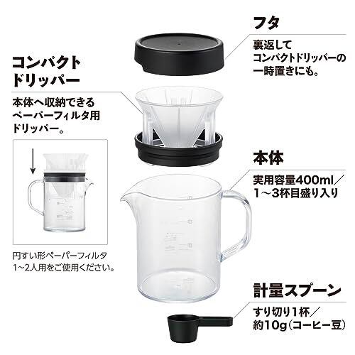 サイズ(約):90×132×126mm、容量:460ml 本体重量 (約) :188g 素材・材質:本体・フタ・リング・ドリッパー/飽和ポリエステル樹脂、ポリプロピレン、計量スプーン/ポリプロピレン 生産国:日本 食器洗浄機対応