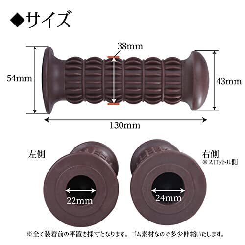 商品内容:バイク用ラバーグリップ左右セット カラー:モスグリーン サイズ:左用内径22mm 右用内径24mm 内側直径54mm 全長13cm グリップ外径38mm カラー展開:ブラック/モスグリーン/ブラウン 非貫通タイプのラバーグリップ。滑りにくくしっかりとした握り心地の汎用タイプグリップ。 ご使用予定バイクのハンドル形状、サイズをご確認の上お求めください。