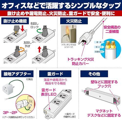 ●タップ本体日本製 ●耐雷サージ機能付 ●抜け止め接地形 ●アース対応 ●本体裏マグネット付 ●断線しにくく被覆強度の高いコード ●接地アダプター付属