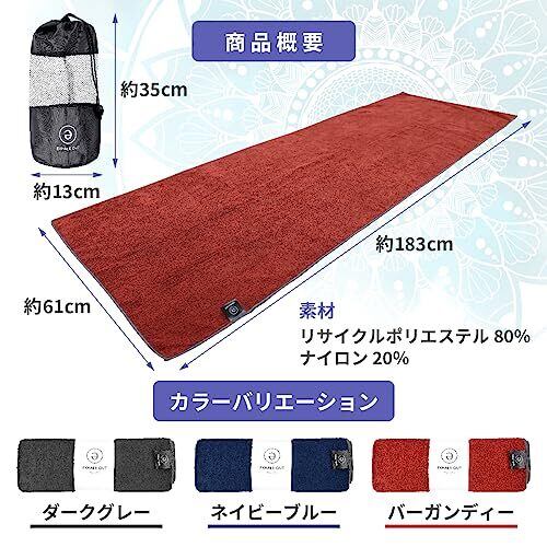 ✅【あらゆるヨガに対応】ヨガマットの上に敷くだけであなたのヨガライフをより快適にしてくれるアイテム「ヨガタオル」をシンプルな単色で仕上げました。女性だけでなく男性でも使いやすいダークカラーです。汚れも目立ちませんので長くお使いいただけます。洗濯機で丸洗いできますので、ヨガ教室でのマットの共用が苦手な方にもおすすめです。 ✅【吸水&速乾】水分をたくさん吸収しますので、たくさんの汗をかくホットヨガや岩盤ヨガでの使用にぴったりのヨガタオルです。ヨガ以外にもバスタオルとしてもお使いいただけますのでビーチ・プール・ジムでも大活躍間違いなしです。通気性の良いメッシュ素材の収納袋がセットになっていますので、濡れたタオルをそのまま収納することができます。 ✅【大判&軽量】通常のバスタオルと比べてかなり大きい縦183cmx横61cm(約)のタオルです。重量は約330gでペットボトル1本分よりも軽いためどこに持って行っても負担になりません。ヨガマット全体をしっかり覆うことができますのでペットによるヨガマットの破損を防ぐ目的でもお使いいただけます。「ワンちゃんがマットをかじってしまった…」「猫ちゃんが爪を研いでしまう…」などのお悩みがある方は是非「ヨガタオル」をお試しください。 ✅【滑り止め効果】汗によってヨガマットの上で滑ってしまった経験はございませんか?ヨガタオルを敷くことで難しいポーズをしても安定します。ヨガを始める前に霧吹き等で湿らせておくとグリップ力がより高まります。タオル単体でもお使いいただけます。地面が柔らかい場所での外ヨガや、砂が熱くなりがちなビーチヨガで重宝します。 ✅【サイズ(約)】マット本体…縦183cmx横61cm、収納袋…縦35cmx横13cm 【重量(約)】マット本体…330g、収納袋…20g 【カラー】ダークグレー、ネイビーブルー、バーガンディー 【素材】リサイクルポリエステル…80%、ナイロン…20% 【洗濯する時の注意点】他の物と一緒に洗濯される場合は、同系色の物と一緒に洗濯機で水洗いをしてください。乾燥機をご使用の際は低温で乾燥させてください。柔軟剤のご使用はお控えください。