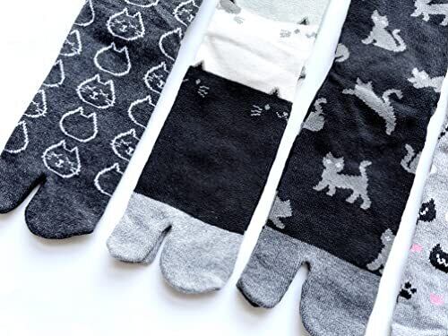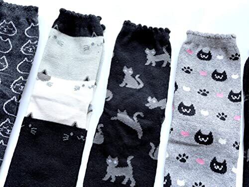 足袋 ソックス レディース かわいい ネコ柄 モノトーン 綿混 口ゴムゆったり 薄手 夏 23-25cm 5足セット(柄はお任せ) B14