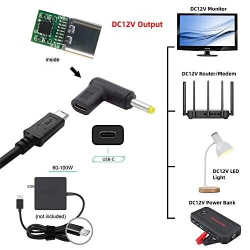USB 3.1 タイプ C USB-C メス DC 12 v 4.0x1.7 mm プラグ アダプター PD エミュレーター トリガー 90 度角度付き Type-Cメス側に12V PDエミュレータトリガーを内蔵しています 入力 Type-Cメス、65W PD Type-Cチャージャー 出力:DCオス, DC 12Vのみ(5V/9V/15V/20Vはサポートしません) 65W Type-Cチャージャーと一緒に使えば、DC12Vポートを持つノートPCをコンセントから便利に充電することができます。