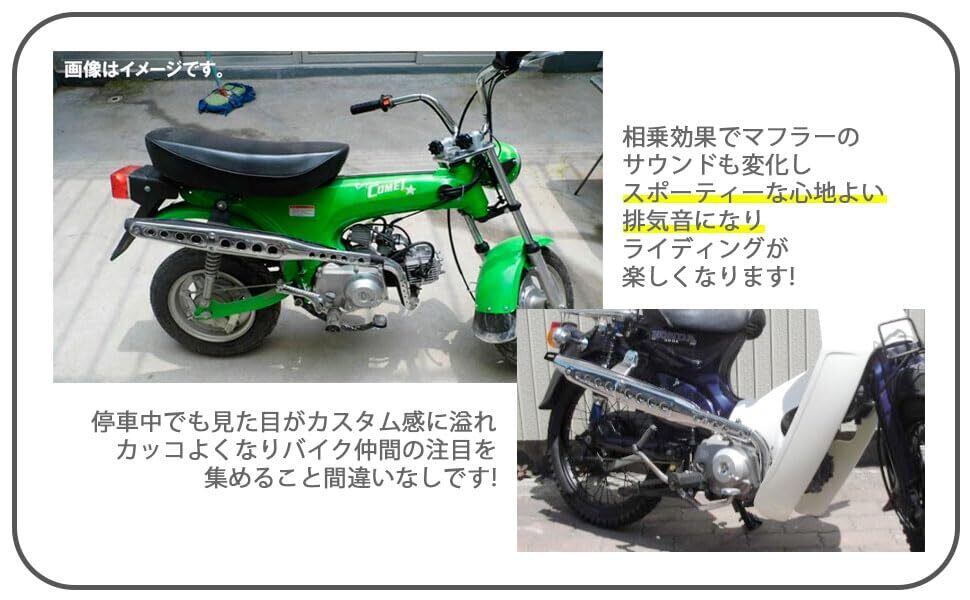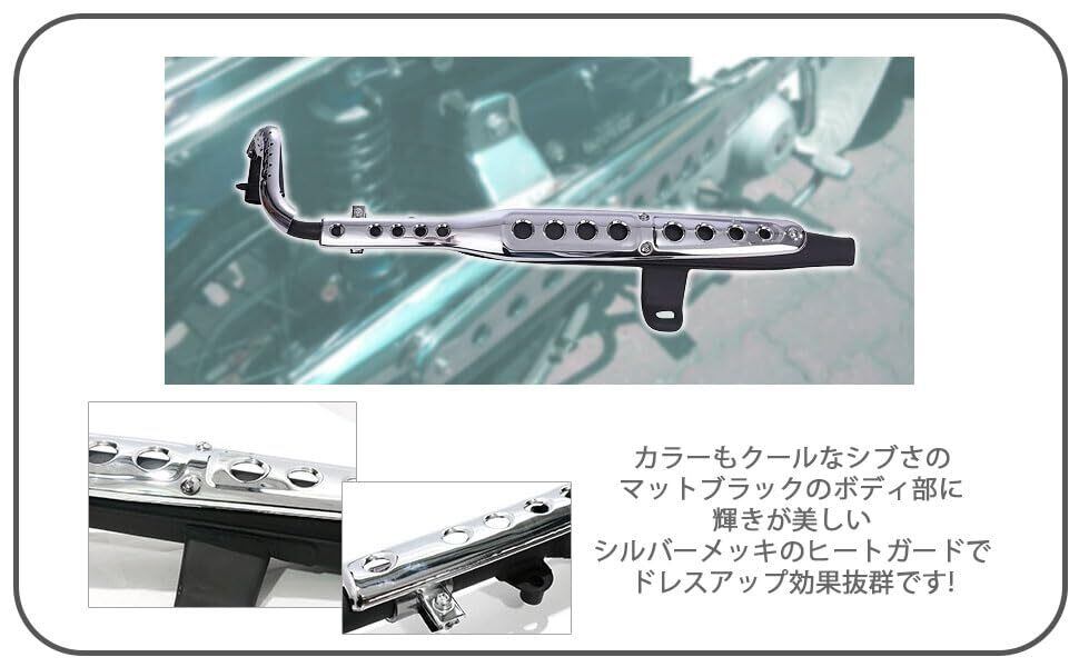 アップマフラー スクランブラーマフラー ホンダ スーパーカブ C50 C70 C90 社外品になります。適合車種:ホンダ スーパーカブ 50 70 90 (C50 / C70 / C90 / AA01 / HA02 )リトルカブ(C50 / AA01)※インジェクション ( FI )車取付不可ですのでご注意お願い致します。※CD50 / 90 Benry50S / 90Sも取付不可になります。 サイズ(約):770mm×300mm フランジボルト穴間隔45mm パイプ外径30mm カラー:シルバーメッキ(ヒートガード)、 ブラック(ボディ) 材質:スチール製 セット内容:マフラー本体(マフラー取り付けボルトは付属致しませんので別途ご用意お願い致します。) マフラーはエンジンからの排気ガスの騒音を、排気管内部のサイレンサーを通して消音する役割があります。 消音の役割の他にも排気ガスがマフラーを通して出て行く勢いで、吸気効率を良くする役割も果たしています。 ノーマルのマフラーではふん詰まりしている排気ガスが、社外品に交換することによって抜けが良くなり排気効率の向上が感じられるようになります。相乗効果でマフラーのサウンドも変化し、スポーティーな心地よい排気音になりライディングが楽しくなります。 停車中でも見た目がカスタム感に溢れカッコよくなり、バイク仲間の注目を集めること間違いなしです。カラーもクールなシブさのマットブラックのボディ部に、輝きが美しいシルバーメッキのヒートガードでドレスアップ効果抜群です。純正マフラーに不満のある方、サウンドが物足りないとお考えの方にオススメのパーツです。
