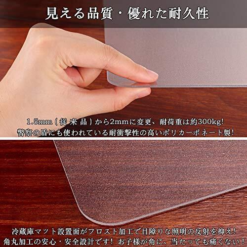 【冷蔵庫や家具 床保護用マット】冷蔵庫マットは「透明な鋼板」と呼ばれる「ポリカーボネート」で作られた。耐荷重は約300kg。冷蔵庫の下に敷くことだけで床を傷や凹みから守ることができる。床の汚れ防止にもなる。わずか1150g(Lサイズ)の重さなので女性の方でも簡単に設置出来る!四つの角の部分はお子様が怪我をさせない様に側面を滑らかに加工している。 【優れた耐衝撃性】従来品(1.5mm)より厚くし、厚み2mmの強度の強いポリカーボネート(PC) 素材を使用。その強度はガラスの250倍になり、防弾盾にも負けない。そのためハンマーなどで叩いても割れない。変形し難く、地震などの災害時でも破損・飛散は無い。長期使用に最適な冷蔵庫マット。 【優れた耐久性】屋外で使用できるほどの耐候性のある素材を採用。冷蔵庫マット素材自体には共押出しフイルム(UVカット)有り、紫外線による樹脂の疲労や黄変を防ぐ。冷蔵庫マットの耐用年数が伸びる。 【床暖房対応】低温も高温(-40℃~+120℃)も耐え、床暖房にも対応する仕様。温度による変形や変色などの心配は要らない。また、電気を通し難い且つ自己消火性高いため、火をつけても燃え広がら無い。安心してお使い頂ける冷蔵庫 マット。 【目障りな照明の反射抑える】① 冷蔵庫マットの片面はフロスト加工がある為、製品は半透明でどんな床にもなじみます。光を吸収しつつ優しく反射し、落ち着いた仕様で目障りな照明の反射を抑えます。