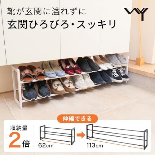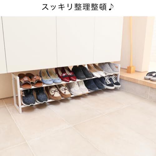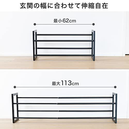スタイリッシュなインテリアにシンプルなシューズスタンド シンプルなデザインのシューズスタンドなので、スッキリとした玄関やシューズクロークにしたい方におすすめです。 こちらのシューズスタンドは伸縮可能で、62~113cmの間で自由自在に幅を決めることができます。最大寸法が113センチと、かなり幅広に伸ばせるのがポイントです。 1段あたりおける靴数は、最小幅:約3足(上下合計6足)、最大幅:約6足(上下合計12足)です。 伸縮式なので玄関収納や下駄箱のサイズに合わせて自由に幅を変えられます。