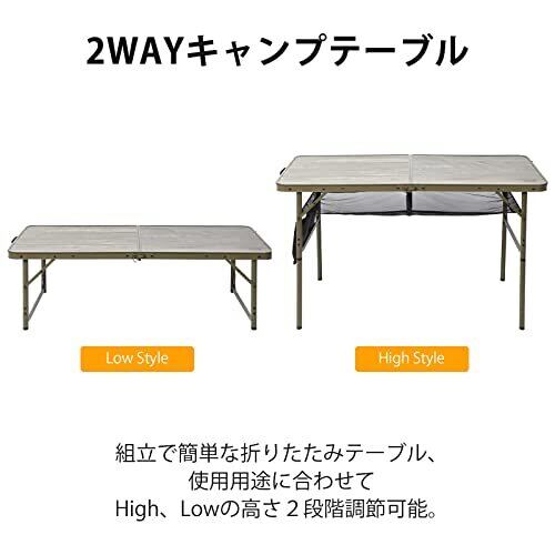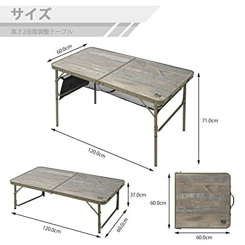 【素材】:材質:アルミニウム 他:天板/メラミン加工合板 サイズ:使用時:約120×60×高さ71/37cm、収納時:約60×60cm 本体重量 : 4.82kg 耐荷重:30kg 【高さ2段階調整】:2段階(71cm/37cm)の高さ調節が可能、様々な用途に合わせ、自由自在に高さを変化させることができます。調節方法は延長用の脚をカチッと付け替えるだけ。女性でも簡単に完成し上げます。 【持ち運び便利&コンパクト収納】:取っ手がついていて持ち運び楽々簡単に!30秒ですぐに完成。アウトドアでもインドアでも1台あると便利です。 【取り外せる雑物収納ナイロンメッシュ付き】:フォールディングテーブルの天板の下には、収納ナイロンメッシュ付き、多くの雑物を収納できます。 不要になった場合はすばやく取り外すことができます。 【いろんなシーン利用できます】:レジャーテーブルとして:キャンプ 釣り テント泊 バーベキュー(BBQ) ピクニック 焚き火 運動会 スポーツ観戦 ビーチ レジャー 花見 海水浴 ビーチ 公園 テラス; 折り畳みテーブルとして自宅勤務に室内用でもとても便利です。 【注意事項】:こちらのアウトドーアテーブルは折りたたんで収納するため、展開後に2枚のテーブルボードの間にわずかな山折りが生じるのは正常な現象であり、製品の品質上の問題ではなく、使用には影響しません。ご購入前にご了承ください。