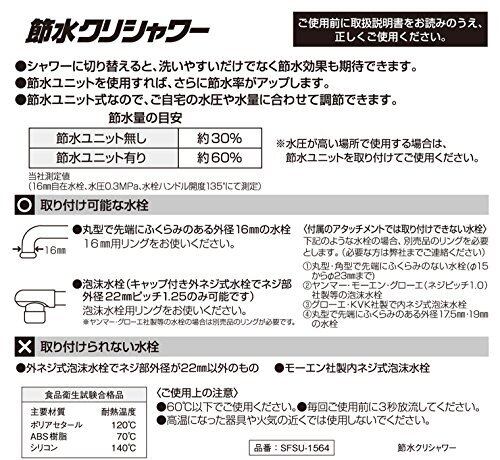 生産国:中国 取り付けられない水栓:外ネジ式泡沫水栓でネジ部口径が23mm以上のもの、モーエン社製内ネジ式泡沫水栓 水流:シャワー、ストレート サイズ:約7x7x3.5cm 取り付け可能水栓:自在水栓(丸型で先端にふくらみのある口径16mm)、泡沫水栓(JIS規格品/ネジ部外径22mm) 材質:ポリアセタール、ABS樹脂、シリコン 節水量の目安/節水ユニット無し:約30%/節水ユニット有り:約60%