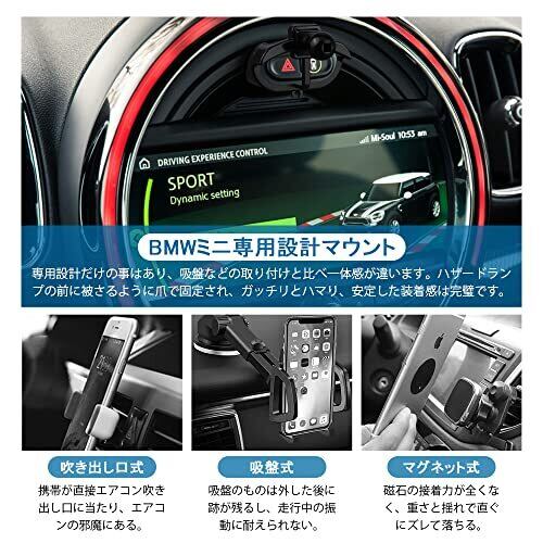 【適応車種】BMW ミニ F54 (2015-2020) / F55 (2014-2020) / F56 (2014-2020) / F57 (2016-2020) / F60 (2017-2019)専用のステー&車載ホルダーセットです。車種専用設計なので、フィッティングは良いです。(※年式やグレードにより、ハザードボタンの形状が異なる場合がございます。画像にて形状をよくご確認下さい。) 【専用設計】ステーが専用設計のため、吸盤やルーバー式のように、たまには運転中に落ちたり、脱いだりことはありません。 【邪魔にならず】車内が狭く、つける場所がないと悩む方へ。車内の純正パーツに挟み込むタイプで、車内狭い収納スペースには大変助かるのでしょう。 【装着簡単】挟み込むタイプのため、取り付けは大変簡単です。スマホの充電に邪魔しません。4 ~6.5インチディスプレイの携帯電話が取り付け可能です。 【車載ホルダー】角度調整可能。お好み視覚角度まで調整できます。ホールド性もバッチリ!