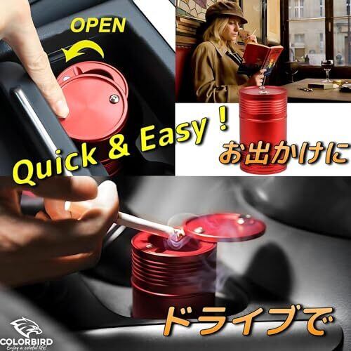 メタリックカラーのドラム缶型のふた付き灰皿。ハードかつスタイリッシュ! 使用はQuick&Easy! ふたをスライドさせると開閉できます。アルミ合金の三層構造で高耐熱性、水を入れても大丈夫は耐水性、底蓋を外して簡単洗浄OK! ふた付きなので臭い防止、灰こぼれの心配不要。 愛車のドリンクホルダーはもちろん、お出かけやお部屋での使用も快適にお使いできます。 【サイズ】Φ6cmx9.5cm 【重量】150g 【素材】アルミ合金