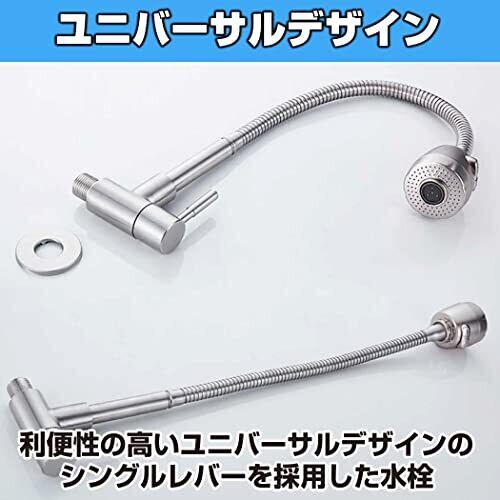 シンプルで使いやすい横水栓:シンプルな形状で使い勝手抜群の横水栓です。十分な高さがあるので、小型の洗面台にも合いやすく、利便性が高いです。ジャバラタイプのホースを採用しているので、自由自在に高さや向きを変えることができます。 ユニバーサルデザイン:利便性の高いユニバーサルデザインのシングルレバーを採用した水栓となっています。お子さんから高齢の方まで、年齢を問わずにお使いいただきやすいデザインです。 ワンタッチで切り替え可能:ノズルの前面にあるスイッチボタンにより、2種類の水流タイプに切り替えることが可能です。手洗いなどに適したシャワータイプ、直流の泡沫タイプの2種類の水流タイプを用途に応じて使い分けできます。 キッチンのシンクや洗面台などに:水回りをスッキリとした印象の見た目にできるコンパクトな設計と、好きな方向に水流を向けられる設計が魅力の逸品です。キッチンのシンクや洗面台、お風呂場など、幅広い場所への設置に適しています。 可動ホース部分の長さ:約21cm 可動不可の部分の長さ:約17cm ネジ規格:G1/2 素材:ステンレス カラー:シルバー ※モニターの環境等により、色の見え方に若干差が生じる場合がございます。