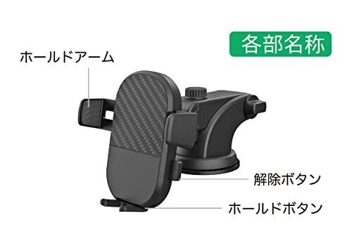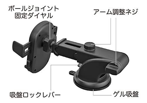 スマホを置くだけでアームが閉じる、ワンタッチ式ホルダー 幅約60mm~86mmのスマーフォンに対応 ボールジョイントで360°見やすい角度に調整可能 約45mmスライド可能な可動式の吸盤アーム