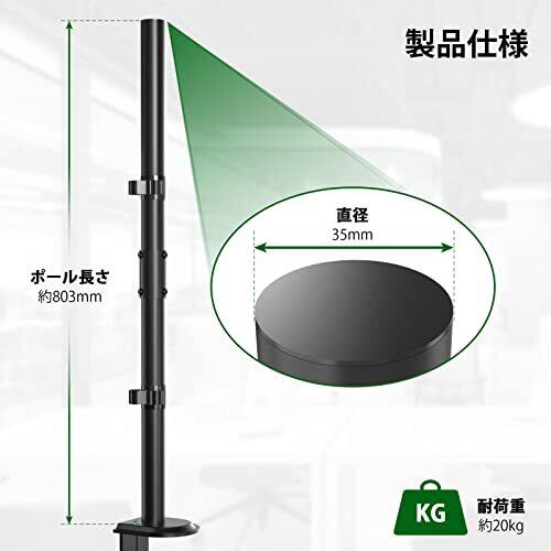 [製品紹介] このモニターアーム用ロングタイプポールは、既存のモニターアームをより高い位置に設置したい方におすすめです。(ポールのみの販売となります。) [製品仕様] ポールの高さは約80cm、直径は3.5cmで、耐荷重は約20kgです(設置については画像をご参照ください)。 [取付方法]クランプ式とネジ固定式(グロメット式)の2種類の取り付け方法があり、デスク厚さはそれぞれ10mm〜85mmと10mm〜40mmに対応しています。 [ケーブル収束] ポールにはケーブルをまとめるパーツが付属しており、スッキリとまとめることができます。デスク周りが整理されて、より快適な作業環境を手軽に実現できます。 [製品保証] ご購入後1年間の保証が付いています。製品に関するご質問やお問い合わせは、当店の問い合わせ窓口までご連絡ください。 ご注意:重たいモニターをつけた場合、ポールがやや前に傾くことがございますが、仕様ですので、ご安心ください。