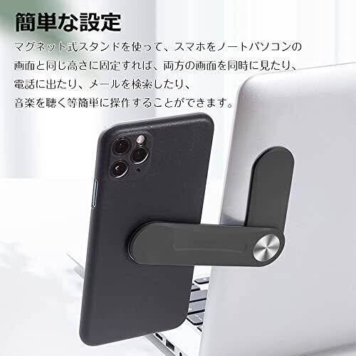 ♥【高品質素材・製品詳細】材質はアルミ合金+スチールで、サンドブラストとシルバーアルマイト仕上げにより高級感と耐久性を兼ね備えます。金属シャフト付きで回転しやすいです。マグネット式スタンド本体サイズ約12x3x0.5cm。重量:約32g 。接着剤メタルリングが付属しており、携帯電話ケースに磁気機能を楽に追加できます。 ♥【実用性抜群・革新なデザイン】マグネット式スタンドを使って、スマホをノートパソコンの画面と同じ高さに固定すれば、両方の画面を同時に見たり、電話に出たり、メールを検索したり、音楽を聴く等簡単に操作することができます。また、革新な折りたたみ式のデザインにより、コンパクト、頑丈で軽量、バッグに簡単に持ち込むことができます。持ち運びも楽します。 ♥【様々な機種に対応可能】ほとんどのノートPCやスマホを幅広くに対応可能です。また、様々なスマホの重量を耐えられます。300g以内の重量をおすすめします。スタンド部を広げるだけで、スマホスタンド、パソコンタンドとしても使えます。 ♥【強力マグネットスタンド】このマグネット式スタンドはノートパソコンの背面にしっかり貼り付けて延長スタンドとして使用することができます。スタンドを好みの位置に回転させるだけで、スマホがスタンドに装着されます。ご注意:このマグネット式スタンドは2次設置には対応しておりませんのでご了承ください。 ♥【お使い方・手間なし】マグネットスタンド可動部が下になるように貼りつける。まず、製品の取り付け時に金属シャフトが下向きになることを確認します。次に、製品背面接着剤を剥がす。そして、パソコンの上、右、左横の3つの場所から1つを選択してインストールします。ご注意:製品を使用する前に、スマホケースの背面にパッケージ内の金属リングを取り付けてください。