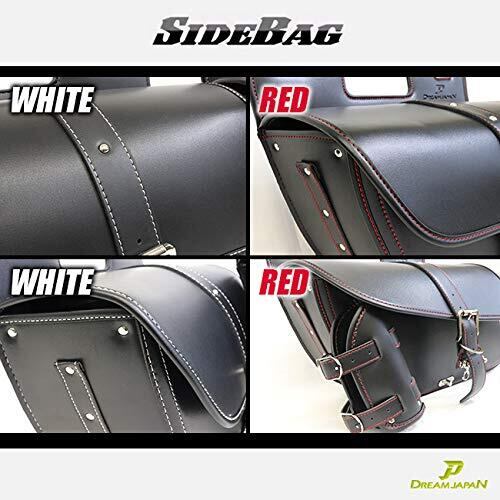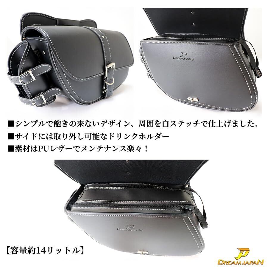 バイク サイドバッグ 大容量14L 多機能 防水 ドリンクホルダー レインカバー 簡易ロック付き 配線穴あり 左側/ドラッグスター/スポーツスター/ビラーゴ/ソフテイル/マグナ/シャドウ/スティード/TW/SR (ホワイトステッチ)