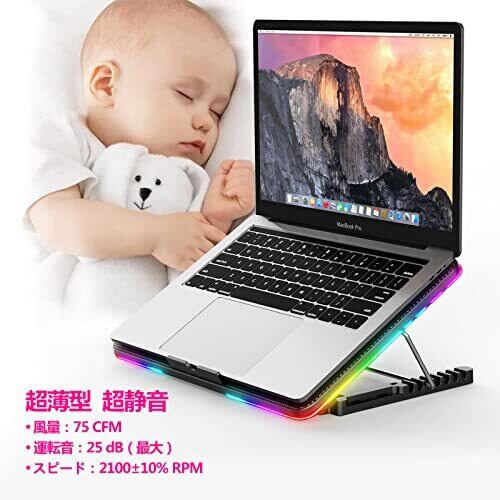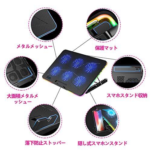 【6つ冷却ファン&風量調節】このノートクーラーに内蔵する6つ強力冷却ファンは空気の流れを加速してノートパソコンの熱を吹き飛ばします、スイッチで風量を調節できます。二つのスイッチは別々の3つファンをコントロールします 【超薄型&超静音】日本人の狭いデスクに楽に使えるノートパソコン冷却ファンのために、製品ボディーとファンの構造を何回改善されましたの結果は冷却スタンドは僅か830g、ファンの全力運転音は25dBだけで実に静音なノートpcクーラーです 【7段階角度調整&メタルメッシュー導熱】7段階高度や角度調整可能多くの人の身長に適して、長時間のテレワークも首や肩に負担掛かりません。冷却スタンドの上面はメタルメッシューのでよい導熱性があり、ノートパソコンの熱を吸収してファンで吹き飛ばすことが出来ます 【シンプルなデザイン&スマホンスタンド付き】余計な要素や飾りなどを捨て、冷却パッド機能を中心としてとてもシンプルなデザインでどんなノートパソコンも相応しいの実用さがあります。パッドの底に隠れ式スマホスタンドが付いてあります 【2USBポート&メーカーより保証】ノートパソコンの連続端子がどんどん少なくなる今、給電のために冷却パッドをパソコンに連続するポート以外もう一個USBポートがあり、マウスやキーボードやUSBメモリなどとパソコン連続する可能となります。一年間の製品保証期間があります、商品に関して何の問題でもお手軽く連絡ください。※ご注意:本製品がRGBライト付きません