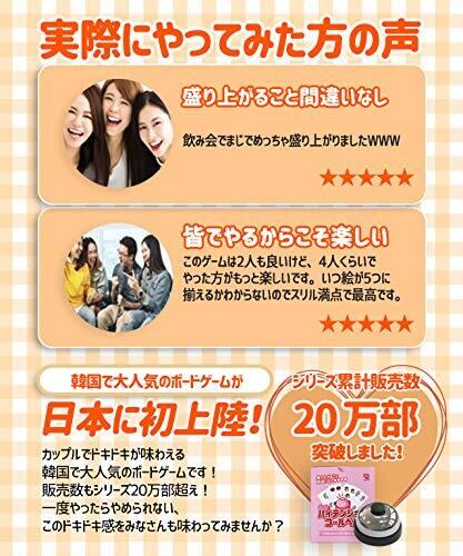【セット内容】カード56枚 ベル1個 説明書 【プレイ人数】2~4人 韓国で大人気の恋愛ボードゲームが日本に上陸!!ベルを鳴らすたびに恋が深まるどきどきゲーム。瞬発力と判断力が試される恋愛早打ちベルゲーム。2人でも大人数のパーティ、飲み会などでも楽しめます。 もっともっと好きになろうよ! 相手との心の距離を縮めるポイントである『コミュニケーション』と『スキンシップ』要素をテーブルゲームに取り入れました。ゲームを楽しむことで自然と仲が深まったという感覚に誰もが驚かされるはず!
