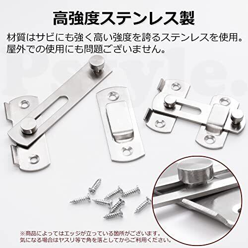 【選べるバリエーション】 Pstyle.ドアロックは使用箇所に合わせて選べるように、サイズが異なる2種類のバリエーションがあります。小は3個セット、大は2個セットです。 【ステンレス製】 材質はサビにも強く、高い強度を誇るステンレス製です。屋内だけではなく、屋外の使用にも使えます。*個体差でエッジが立っている場合があります。気になる場合はヤスリ等で角を落としてからご利用ください。 【引き戸をしっかりロック】 鍵のついていないスライディングドアへの設置、防犯用に2つ目の内鍵としてなど、使いやすい後付けの補助錠です。取り付け用のネジが付属していますので、買い足す必要はありません。取り付けたい場所にネジで固定してすぐにお使いいただけます。 【様々なタイプのドアに】 取り付け位置が平面であれば、玄関、門扉、部屋の窓や扉、開き戸など、スライドドア以外の場所にも活用できます。子供のいたずら防止や猫の脱走防止まで。DIYでしっかりセキュリティ対策ができます。 【パッケージ】 小:3個セット。 大:2個セット。