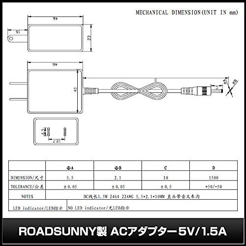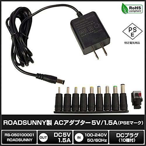 安心の1年保証※ACアダプタ本体のみ/DCプラグ(オス側)のプラグサイズ変更可能な10種セットです。/【外形寸法(本体)】サイズ:約46×40×23mm(奥行/幅/高さ)/ケーブル長:約1.5m 【仕様】メーカー:ROADSUNNY/特定電気用品:PSE対応/RoHS対応/入力:100~240VAC 50/60Hz/出力:5V 1500mA (1.5A) 7.5W/DCプラグ外径:5.5mmφ/DCプラグ内径:2.1mmφ/極性:センタープラス/重量:約67g 【製品特徴】小型で使いやすい5VスイッチングACアダプタです。OAタップに複数個差しても邪魔にならないコンパクトさ。電気用品安全法に基づく表示(PSE)のある商品です。 【注意事項】AC100V DC5V専用のアダプタです。その他電圧の製品にはご使用になれません。 ご使用を予定しております製品の入力電圧・入力電流及びプラグサイズ等をご確認の上、ご使用ください。