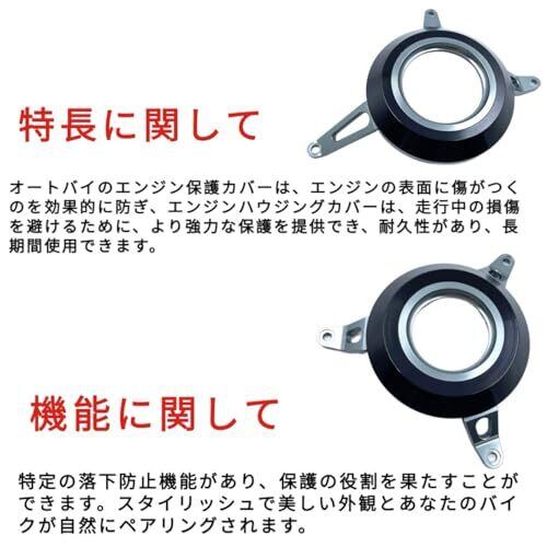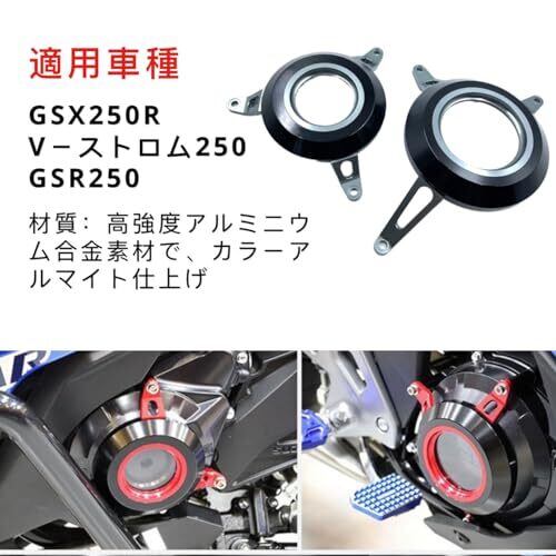適用車種:スズキGSX250R Vストローム250 GSR250 材質:高強度アルミニウム合金素材で、カラーアルマイト仕上げ。 特徴:アルミニウム合金製である。外見は滑らかで線感が十分で、品質は優れている。 効果:不測の転倒を保護し、エンジンの損傷を軽減することができる。ユニークなデザインで、機能と美観を両立させる。 取り付け:対応する長さのボルトとスリーブを備え、大きさと穴の位置が適切で、取り付けが簡単である。